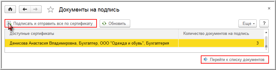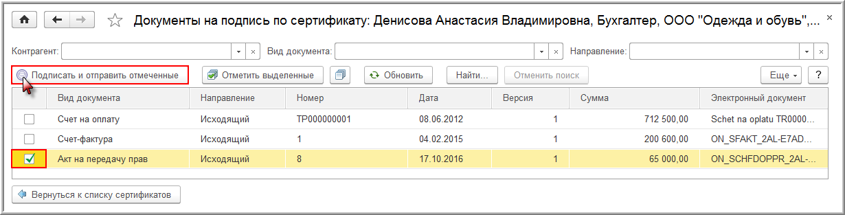 Все сформированные электронные документы подписываются при выполнении команды Подписать и отправить все по сертификату (рис. 10).
