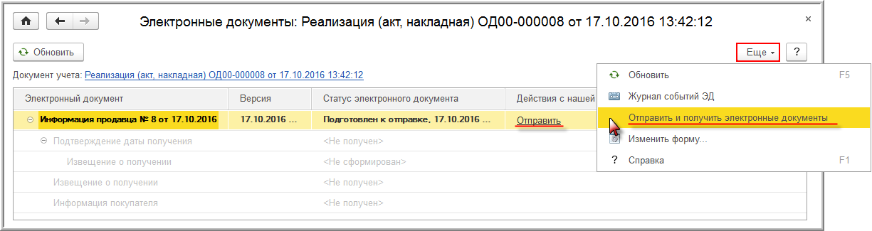 - из формы "Электронные документы" (Таблицы состояния) при выполнении команды Отправить в поле "Действия с нашей стороны" или команды Отправить и получить электронные документы из списка команд, открываемого по кнопке Еще (рис. 14).