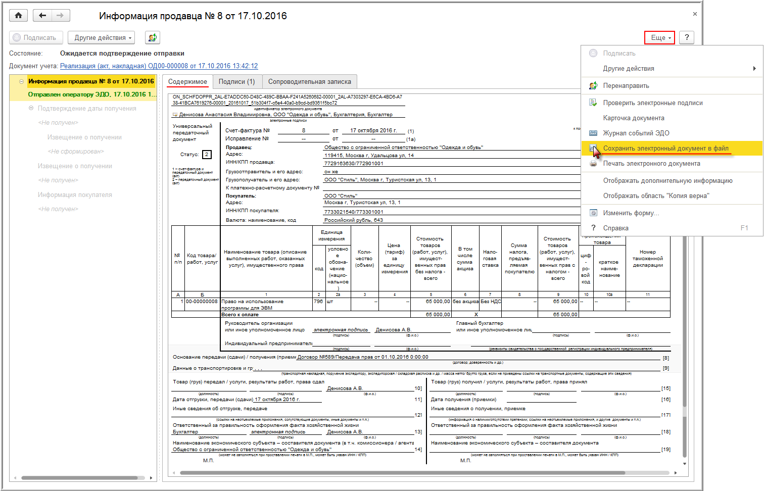 Из формы просмотра, вызвав команду Сохранить электронный документ в файл из списка доступных команд, открываемого по кнопке Еще, можно сохранить электронный УПД вместе с электронной подписью (рис. 16).
