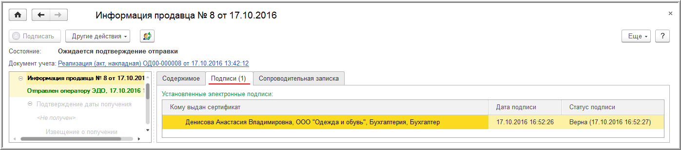 Если у текущего пользователя есть право подписи и сертификат подписи установлен на компьютере, то после выполнения команды Отправить электронный документ из документа "Реализация (акт, накладная)" (рис. 6) или Утвердить и подписать из списка "Текущие дела ЭДО" (рис. 8) программа подготовит подписанный электронный УПД для отправки. Если права подписи у пользователя нет, то программа направит сформированный электронный УПД на подпись лицу, имеющему такое право.