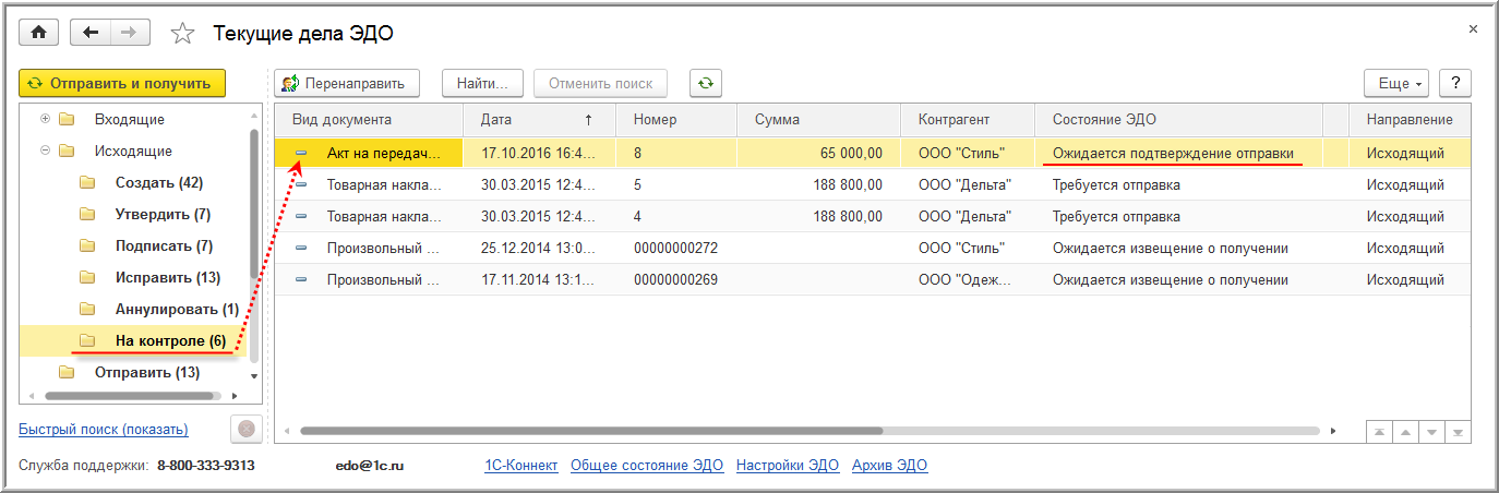 Отправленный УПД, в отношении которого ожидается получение подтверждения оператора ЭДО и информации покупателя, перекладывается в папку документов "На контроле" формы списка документов "Текущие дела ЭДО" (рис. 18).