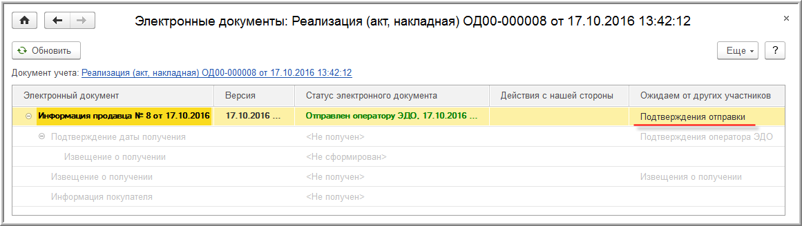 После формирования, подписания и отправки УПД в документе "Реализация (акт, накладная)" в строке состояния будет содержаться информация "Ожидается подтверждение отправки" (рис. 19).