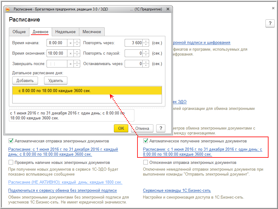 Также можно установить расписание получения электронных документов, выполнив соответствующую настройку параметров обмена электронными документами с контрагентами (раздел Администрирование - гиперссылка Обмен электронными документами) (рис. 21).