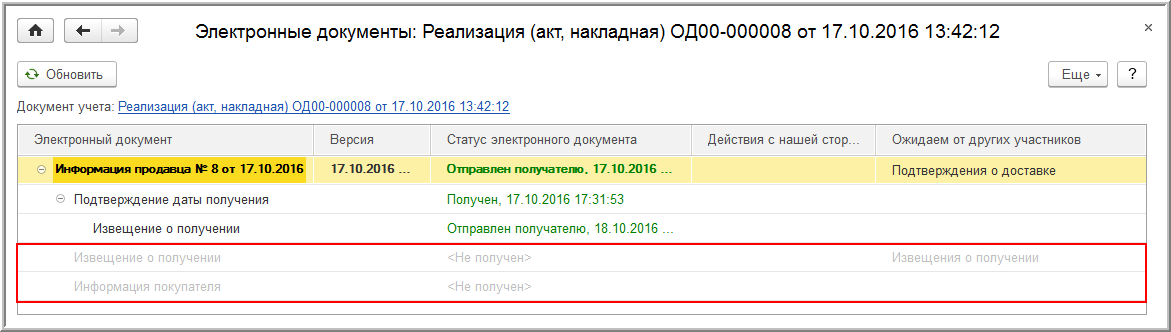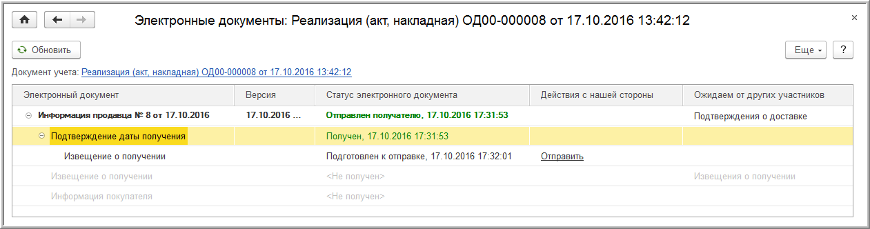 Для просмотра содержимого каждого электронного документа (УПД (информация продавца), подтверждений, извещений, УПД (информации покупателя)) с описанием прохождения всех необходимых статусов обмена необходимо дважды щелкнуть по соответствующей активной строке в форме списка.