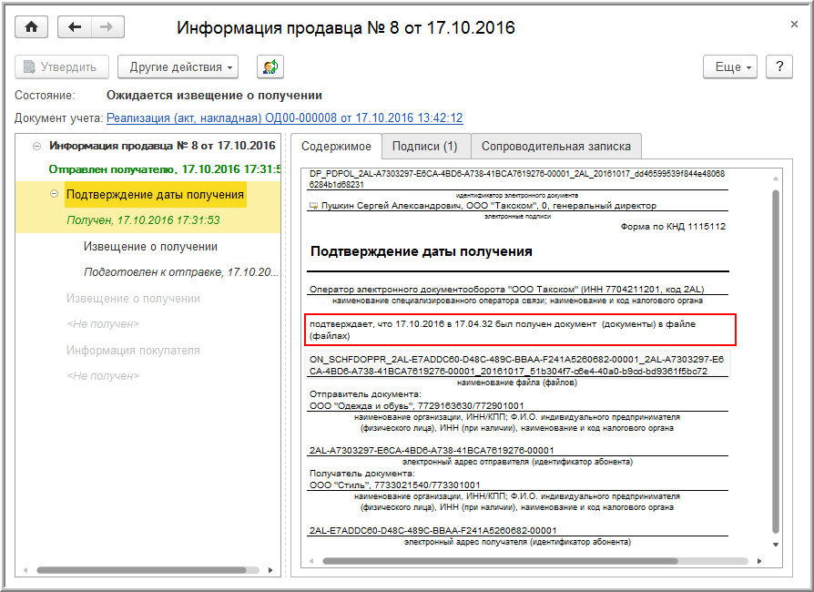 Формирование извещения происходит в программе автоматически. Если у текущего пользователя есть право подписи и сертификат подписи установлен на компьютере, то извещение о получении подтверждения будет также автоматически подписано и отправлено оператору ЭДО. Если у текущего пользователя права подписи нет, то сформированное извещение будет направлено на подпись лицу, имеющему такое право.
