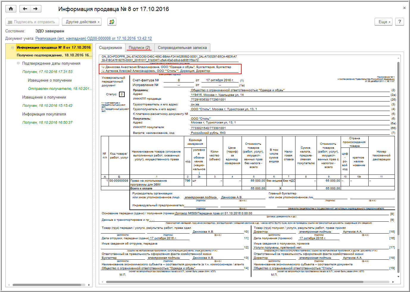 После завершения обмена в режиме просмотра электронного УПД будет отражена информация о подписании документа обеими сторонами сделки (рис. 28).