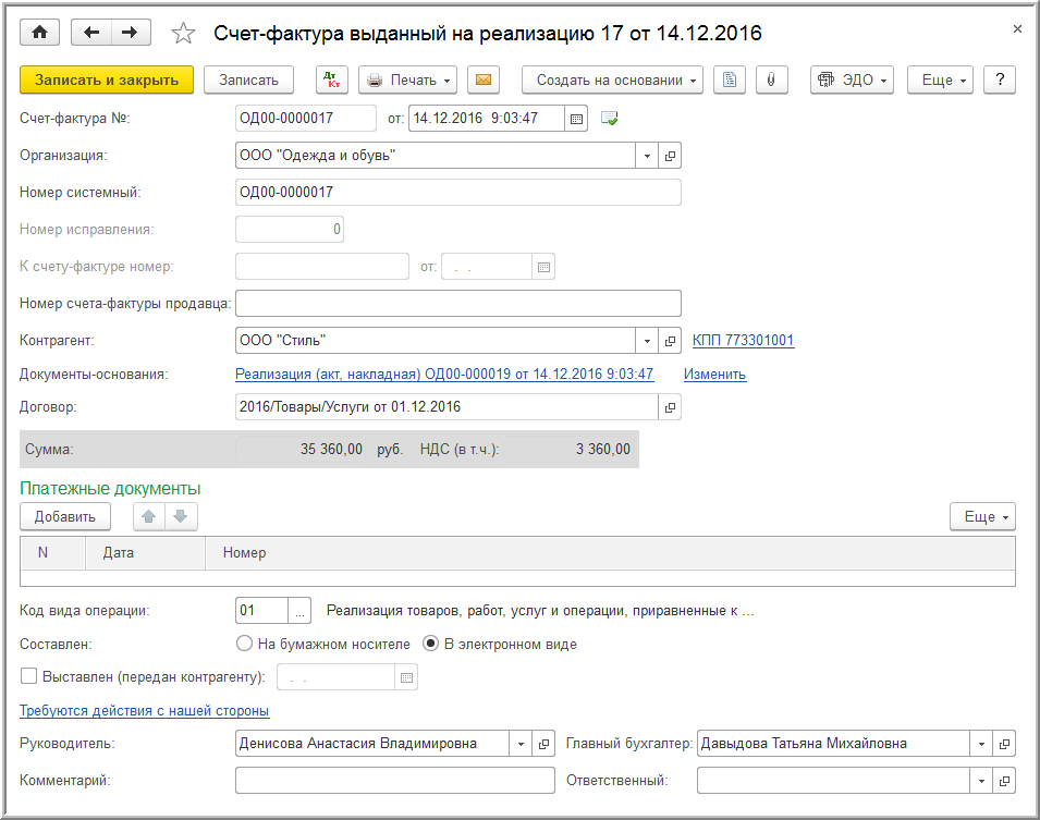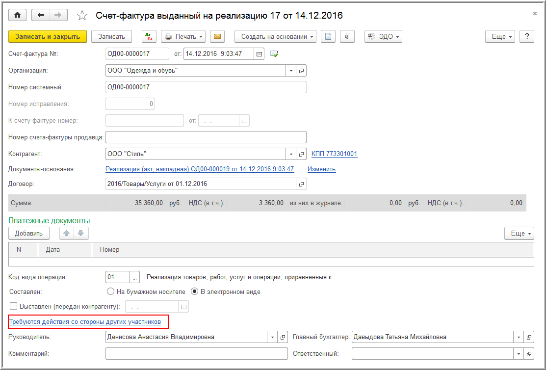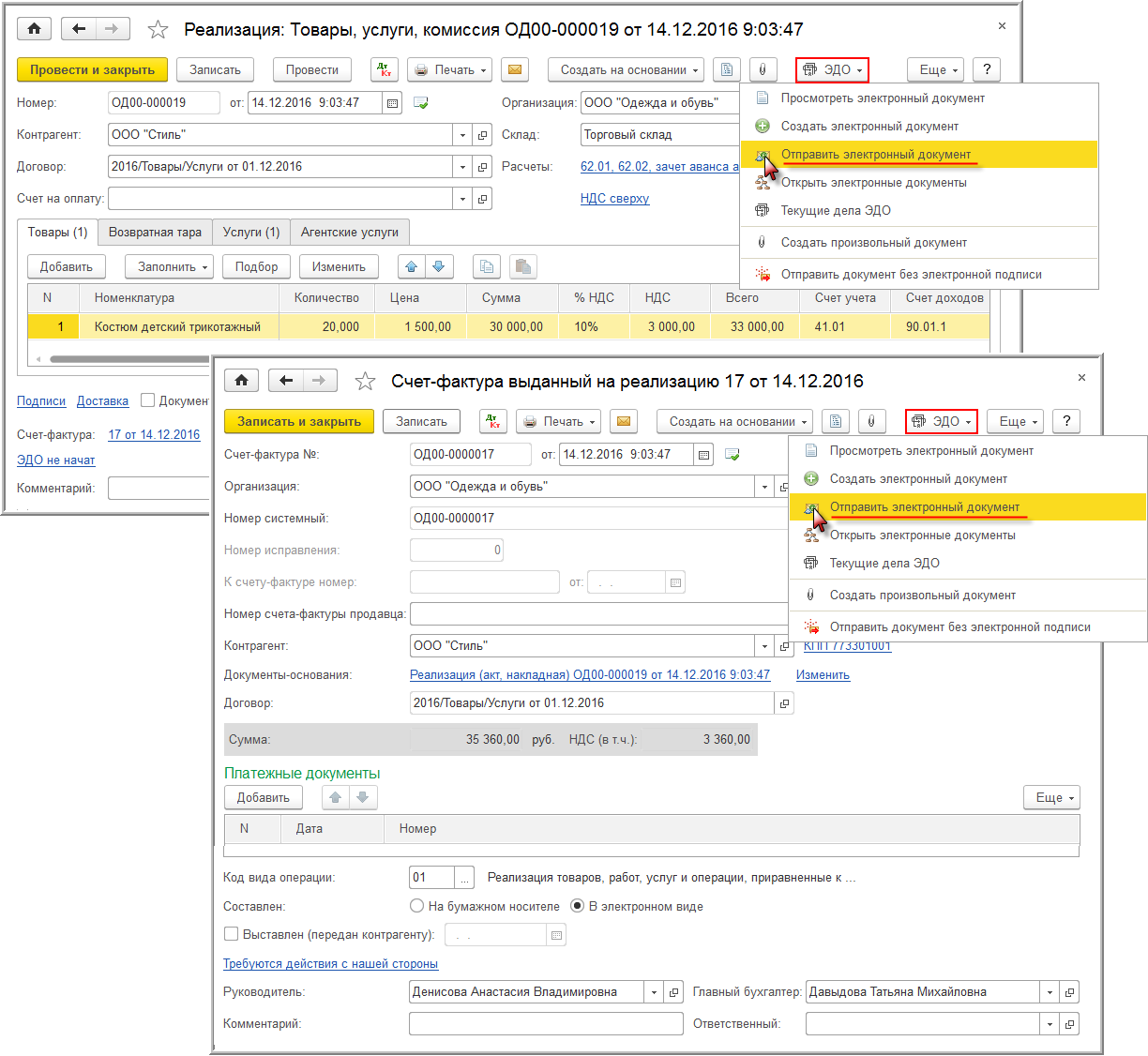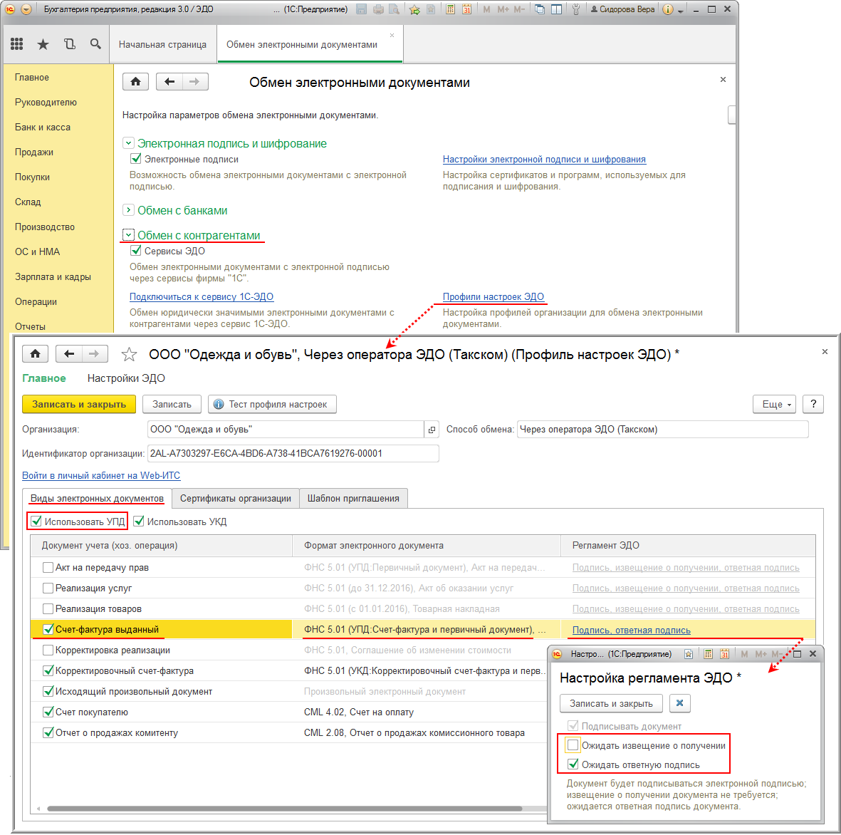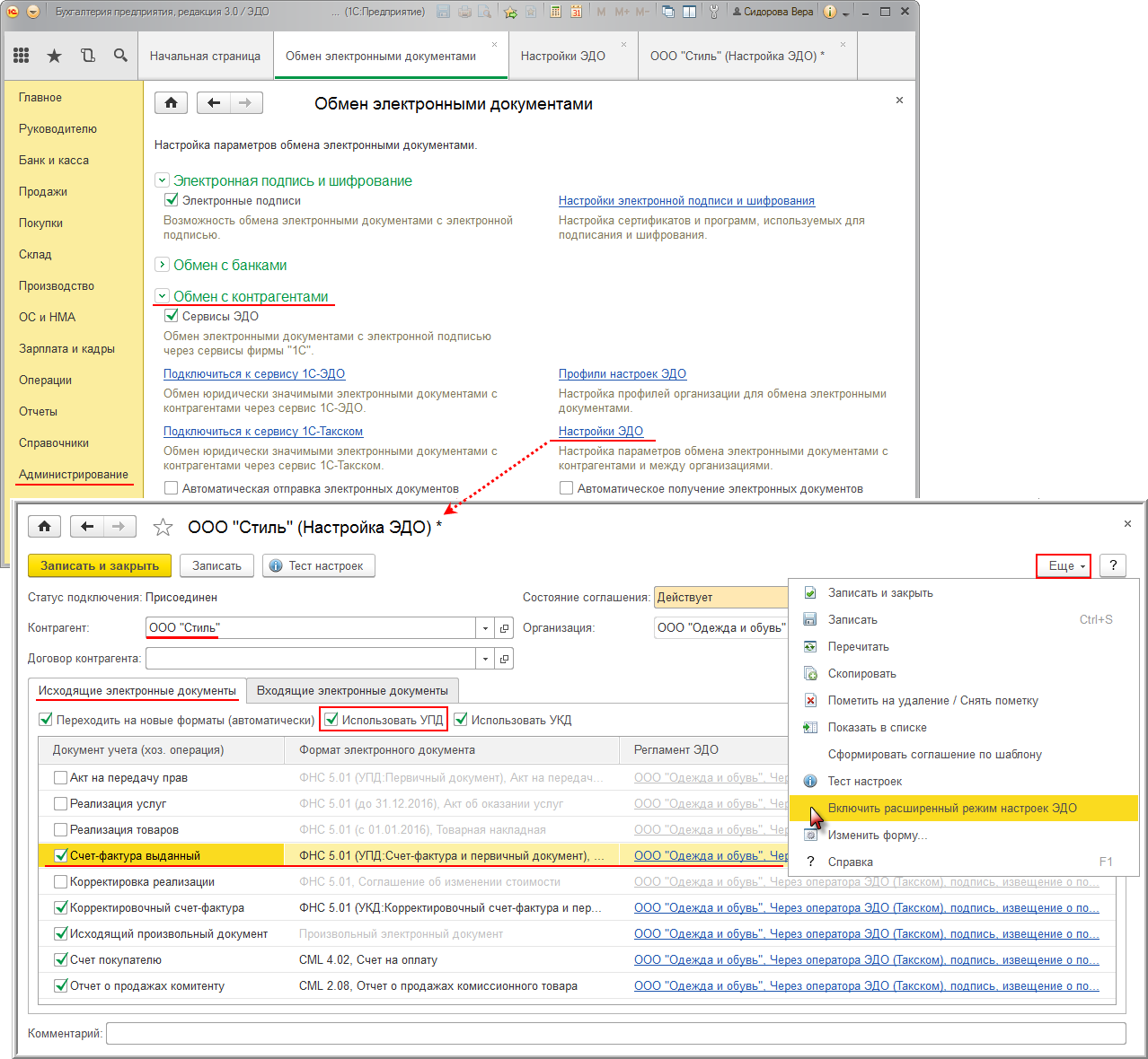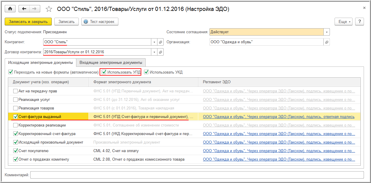 Если организация ООО "Одежда и обувь" по согласованию с контрагентом ООО "Стиль" применяет электронный УПД с функцией счета-фактуры и первичного учетного документа (утв. приказом ФНС России от 24.03.2016 № ММВ-7-15/155@), то для оформления операций отгрузки товаров и оказания транспортных услуг, облагаемых НДС, ей необходимо выполнить следующие настройки.