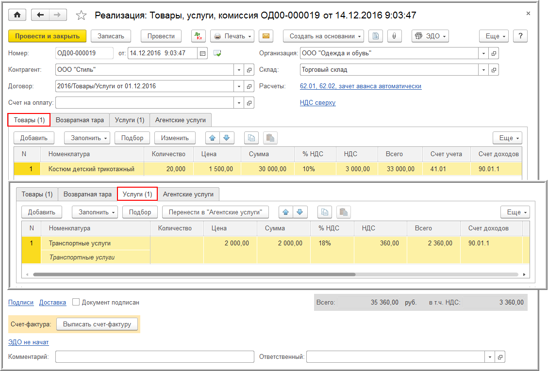 Поскольку по договору организация ООО "Одежда и обувь" с помощью УПД оформляет и операцию отгрузки товаров, и операцию оказания услуги по доставке товаров покупателю (письмо ФНС России от 23.09.2016 № ЕД-4-15/17910), то для одновременного отражения этих операций в программе целесообразно использовать документ учетной системы "Реализация (акт, накладная)" с видом операции "Товары, услуги, комиссия" (рис. 4).