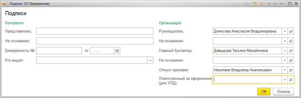 По гиперссылке "Подписи" документа учетной системы "Реализация (акт, накладная)" можно открыть дополнительное окно для указания уточняющей информации об участниках операции с целью автоматического заполнения соответствующих строк УПД (рис. 5):