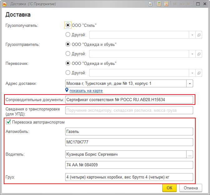 Поэтому при доставке товаров силами продавца следует проставить флажок для значения "Перевозка автотранспортом" и заполнить сведения о марке и номере автомобиля, о водителе, а также, при необходимости, указать вид упаковки, массу нетто/брутто груза и т.д. (рис .6).