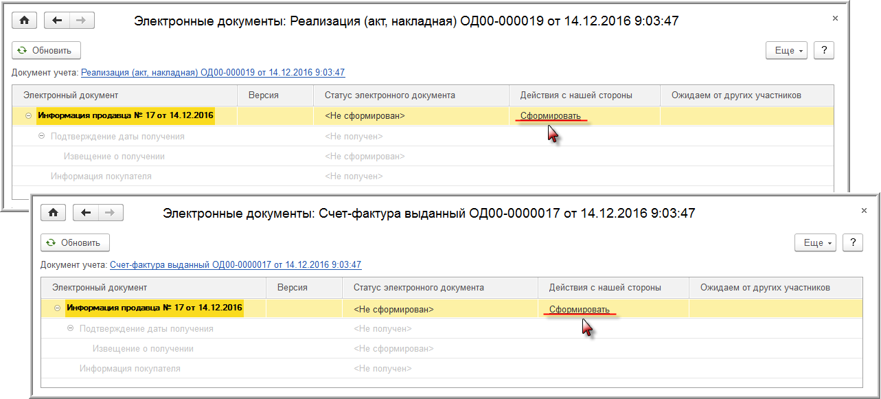 Сформировать электронный УПД также можно с помощью команды Сформировать из формы "Электронные документы" (Таблицы состояния) (рис. 9), которая открывается по гиперссылке строки стояния электронного обмена или по команде Открыть электронные документы из списка команд, открываемого по кнопке ЭДО документов "Реализация (акт, накладная)" или "Счет-фактура выданный" (рис. 8).