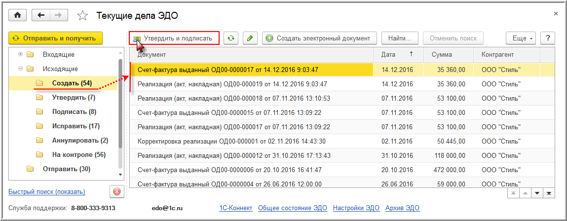 В случае, если необходимо только сформировать электронный УПД, а далее направить его уполномоченному лицу на утверждение, а уже потом на подписание, то из списка доступных команд, открываемого по кнопке ЭДО, следует выбрать команду Создать электронный документ (рис. 8). Тогда сформированный электронный документ сначала будет помещен в папку "Утвердить" списка документов "Текущие дела ЭДО", а уже после утверждения перемещен в папку "Подписать" (рис. 11).