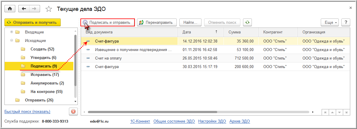 Подписать электронный УПД можно по кнопке Подписать и отправить, выбрав соответствующий документ из папки "Подписать" списка "Текущие дела ЭДО", в которую сформированный электронный документ будет автоматически переложен (рис. 11).