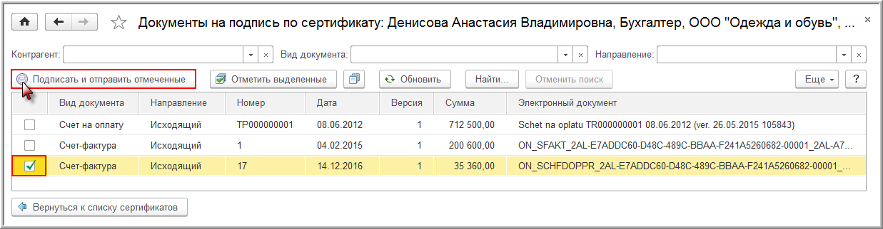 Все сформированные электронные документы подписываются при выполнении команды Подписать и отправить все по сертификату (рис. 12).