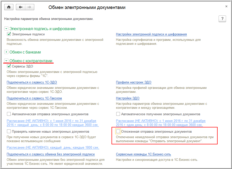 Можно установить расписание отправки электронных документов, выполнив соответствующую настройку параметров обмена электронными документами с контрагентами (раздел Администрирование - гиперссылка Обмен электронными документами) (рис. 17).