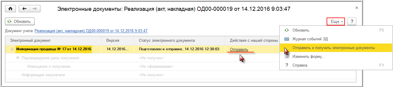 - из формы "Электронные документы" (Таблицы состояния) при выполнении команды Отправить в поле "Действия с нашей стороны" или команды Отправить и получить электронные документы из списка команд, открываемого по кнопке Еще (рис. 16).