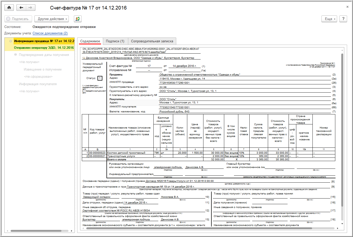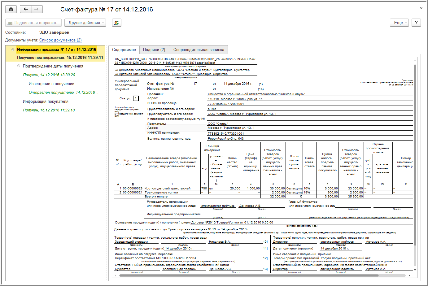 После завершения обмена в режиме просмотра электронного УПД будет отражена информация о подписании документа обеими сторонами сделки (рис. 32).
