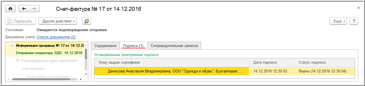 Если у текущего пользователя есть право подписи и сертификат подписи установлен на компьютере, то после выполнения команды Отправить электронный документ из документа "Реализация (акт, накладная)" или документа "счет-фактура выданный" (рис. 8) или Утвердить и подписать из списка "Текущие дела ЭДО" (рис. 10) программа подготовит подписанный электронный УПД для отправки. Если права подписи у пользователя нет, то программа направит сформированный электронный УПД на подпись лицу, имеющему такое право.