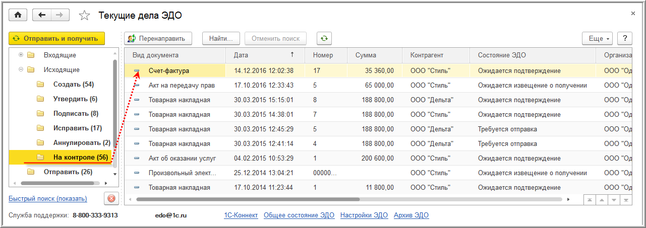 Отправленный УПД, в отношении которого ожидается получение подтверждения оператора ЭДО и информации покупателя, перекладывается в папку документов "На контроле" формы списка документов "Текущие дела ЭДО" (рис. 20).
