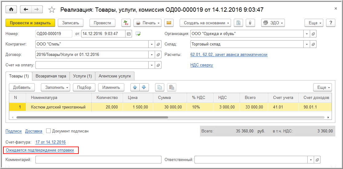 После формирования, подписания и отправки УПД в документе "Реализация (акт, накладная)" в строке состояния будет содержаться информация "Ожидается подтверждение отправки" (рис. 21).