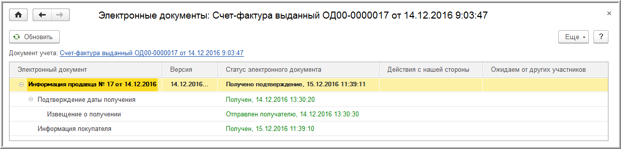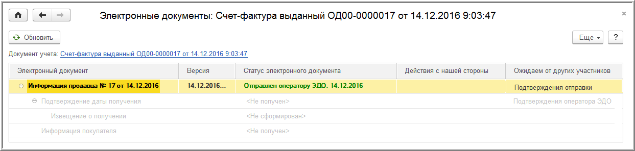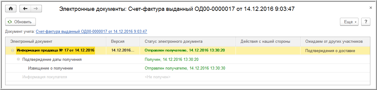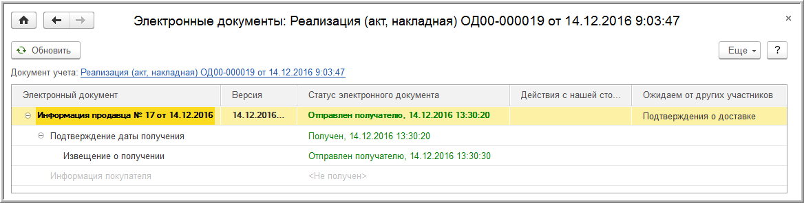 Для просмотра содержимого каждого электронного документа (УПД (информация продавца), подтверждений, извещений, УПД (информации покупателя)) с описанием прохождения всех необходимых статусов обмена необходимо дважды щелкнуть по соответствующей активной строке в форме списка.