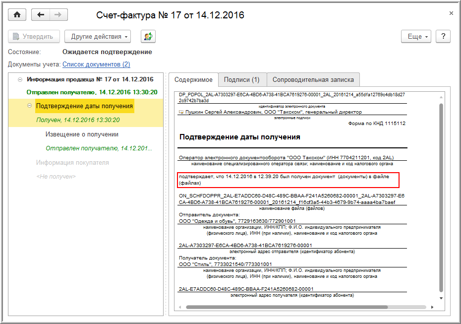 Формирование извещения происходит в программе автоматически. Если у текущего пользователя есть право подписи и сертификат подписи установлен на компьютере, то извещение о получении подтверждения будет также автоматически подписано и отправлено оператору ЭДО. Если у текущего пользователя права подписи нет, то сформированное извещение будет направлено на подпись лицу, имеющему такое право.