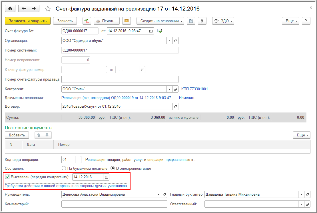 - в поле "Выставлен (передан контрагенту)" до отправки электронного документа и получения подтверждения оператора будет отсутствовать дата выставления.