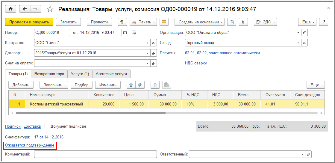 После отправки извещения о получении подтверждения оператора ЭДО в информационной строке документа "Реализация (акт, накладная)" будет отражена информация: "Ожидается подтверждение" (рис. 28).