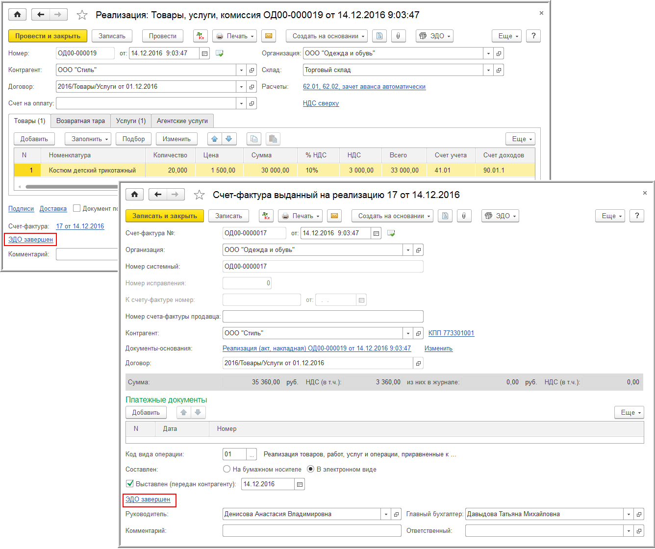 В документе "Реализация (акт, накладная)" и в документе "Счет-фактура выданный" в информационной строке появятся статусы "ЭДО завершен" (рис. 30).