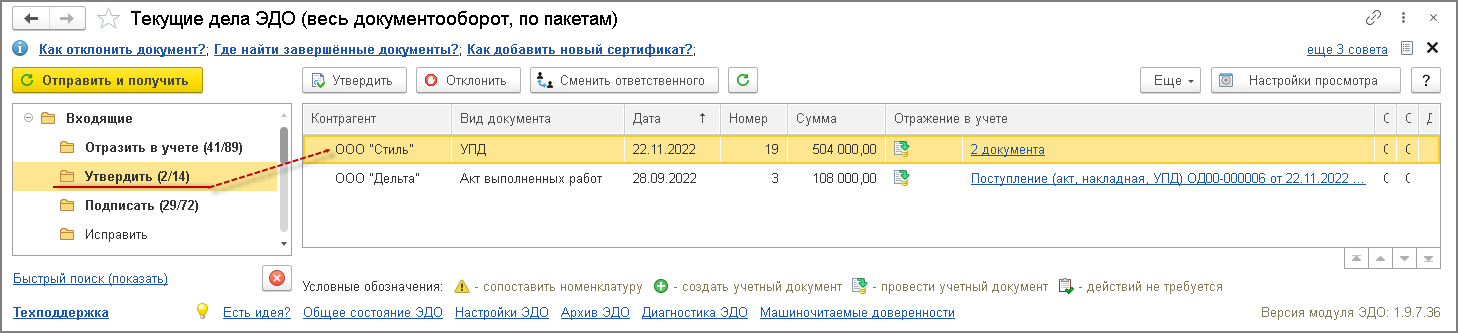 В случае, если в настройках ЭДО (раздел Администрирование - Обмен электронными документами - Обмен с контрагентами - Настройки ЭДО) дополнительно установлен флажок для значения "Отправлять входящие документы на утверждение" (рис. 2), то поступивший УПД(СЧФДОП) будет помещен также в папку "Утвердить" списка входящих документов формы "Текущие дела ЭДО" (рис. 3).