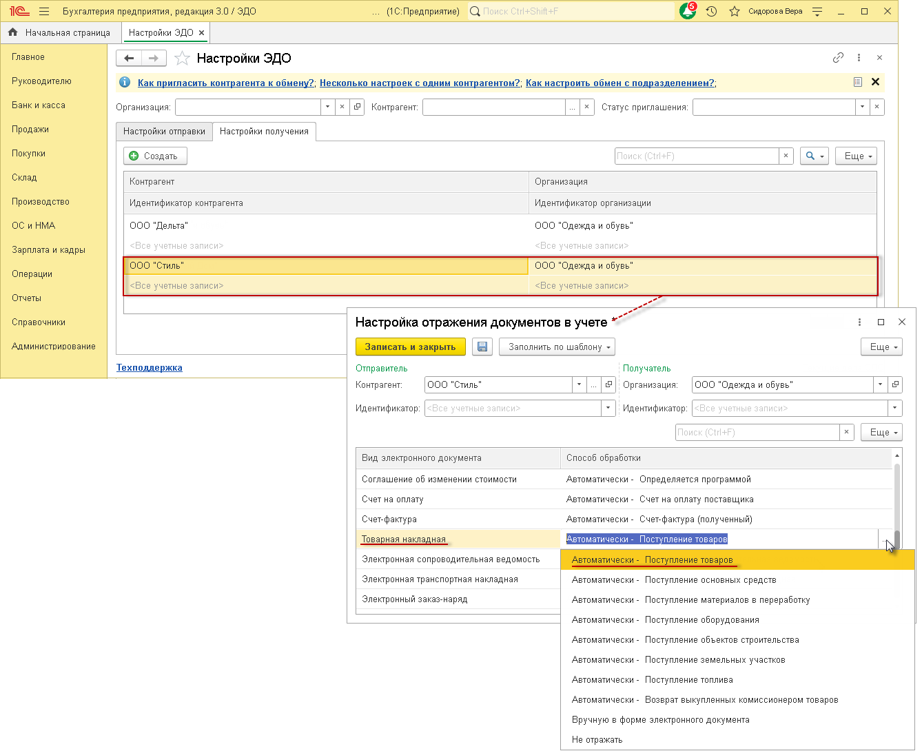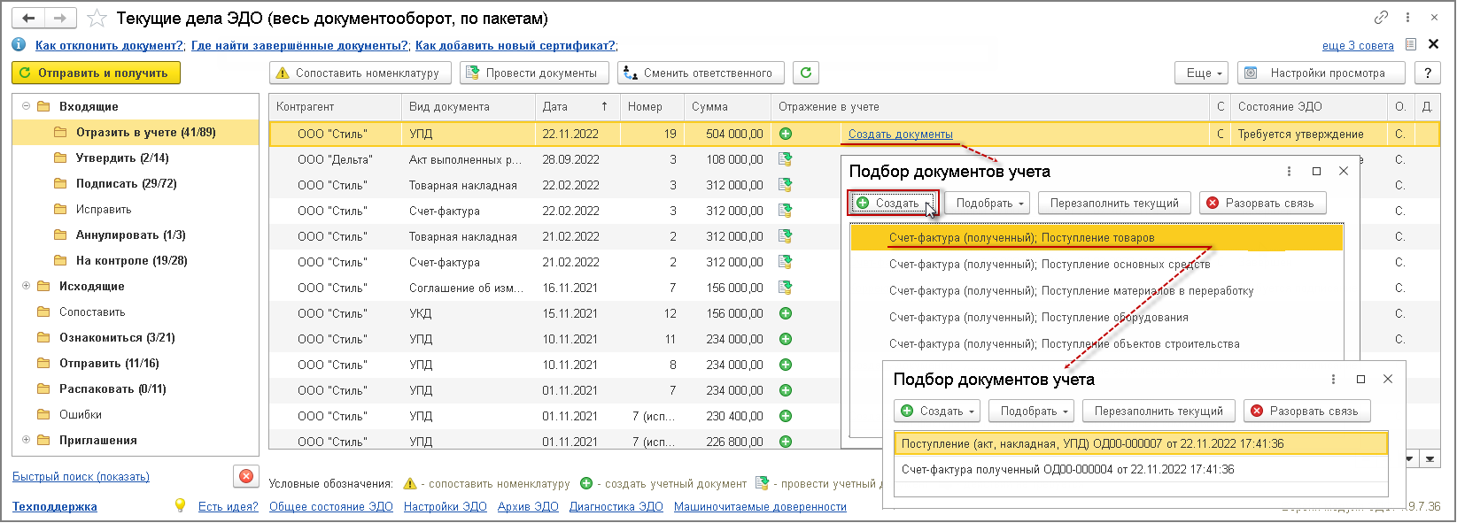 Таким образом, при выборе автоматического способа отражения (рис. 4) при получении УПД(СЧФДОП) будут созданы два документа учета: "Поступление (акт, накладная, УПД)" и "Счет-фактура полученный". При этом в соответствующей активной строке в графе "Отражение в учете" списка документов "Текущие дела ЭДО" появится гиперссылка на автоматически созданные документы - 2 документа (рис. 1).