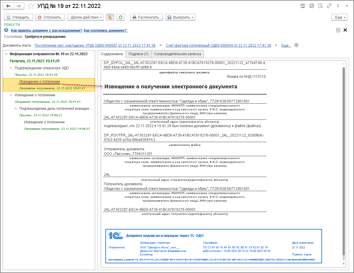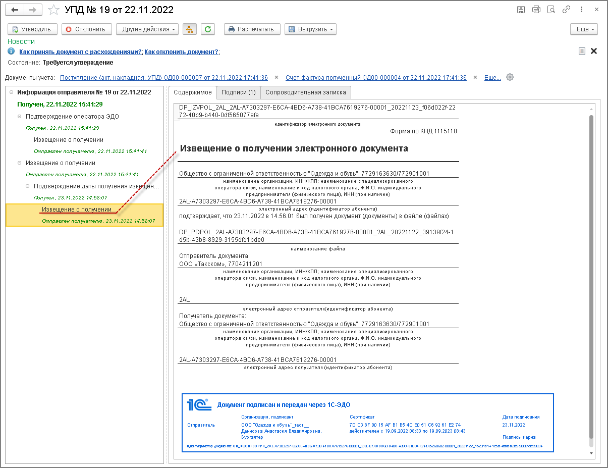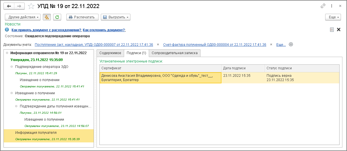 Если у текущего пользователя есть право подписи и сертификат подписи установлен на компьютере, то извещение о получении УПД(СЧФДОП) будет также автоматически подписано и отправлено оператору ЭДО. Если у текущего пользователя права подписи нет, то сформированное извещение будет направлено на подпись лицу, имеющему такое право.