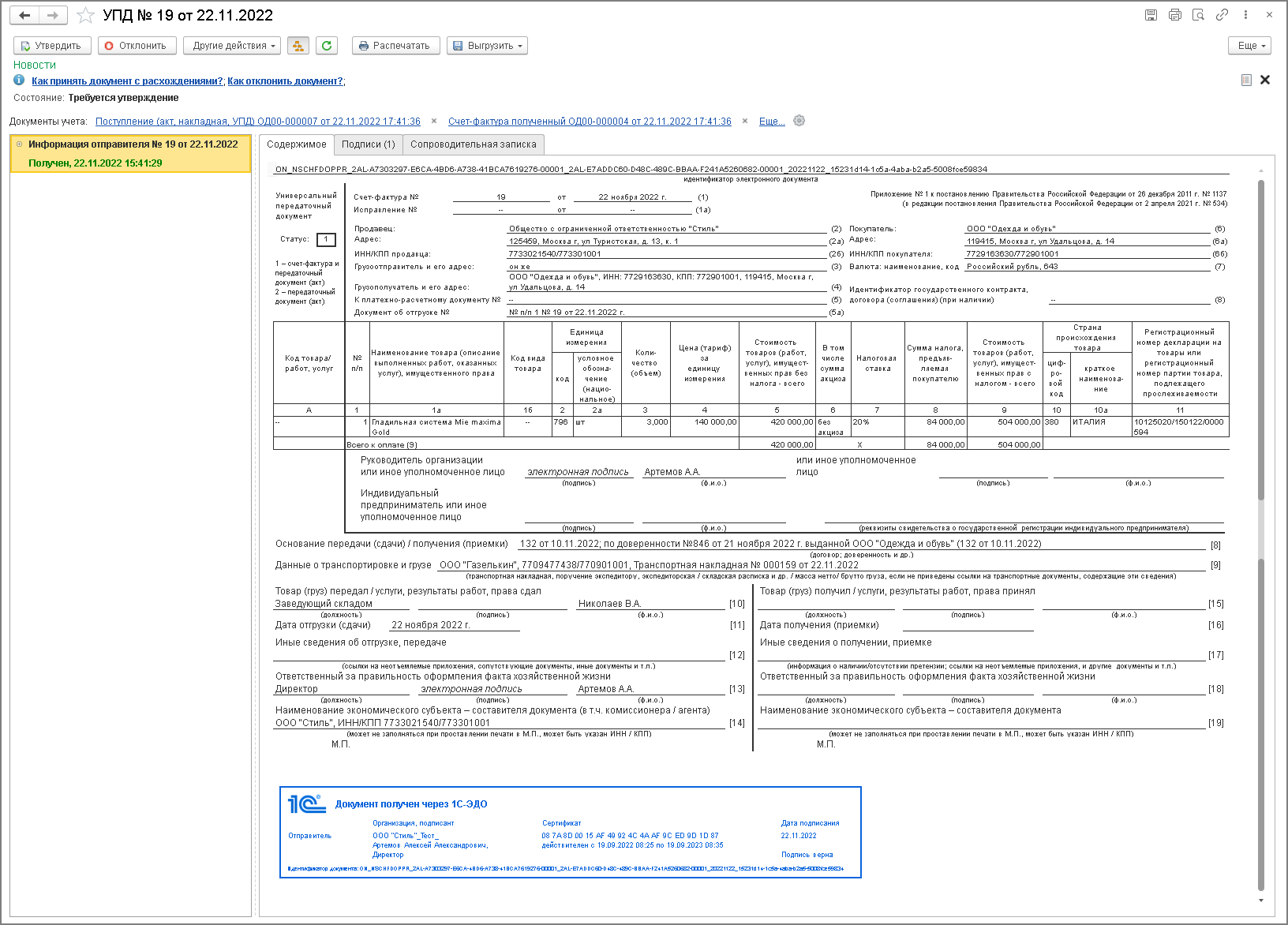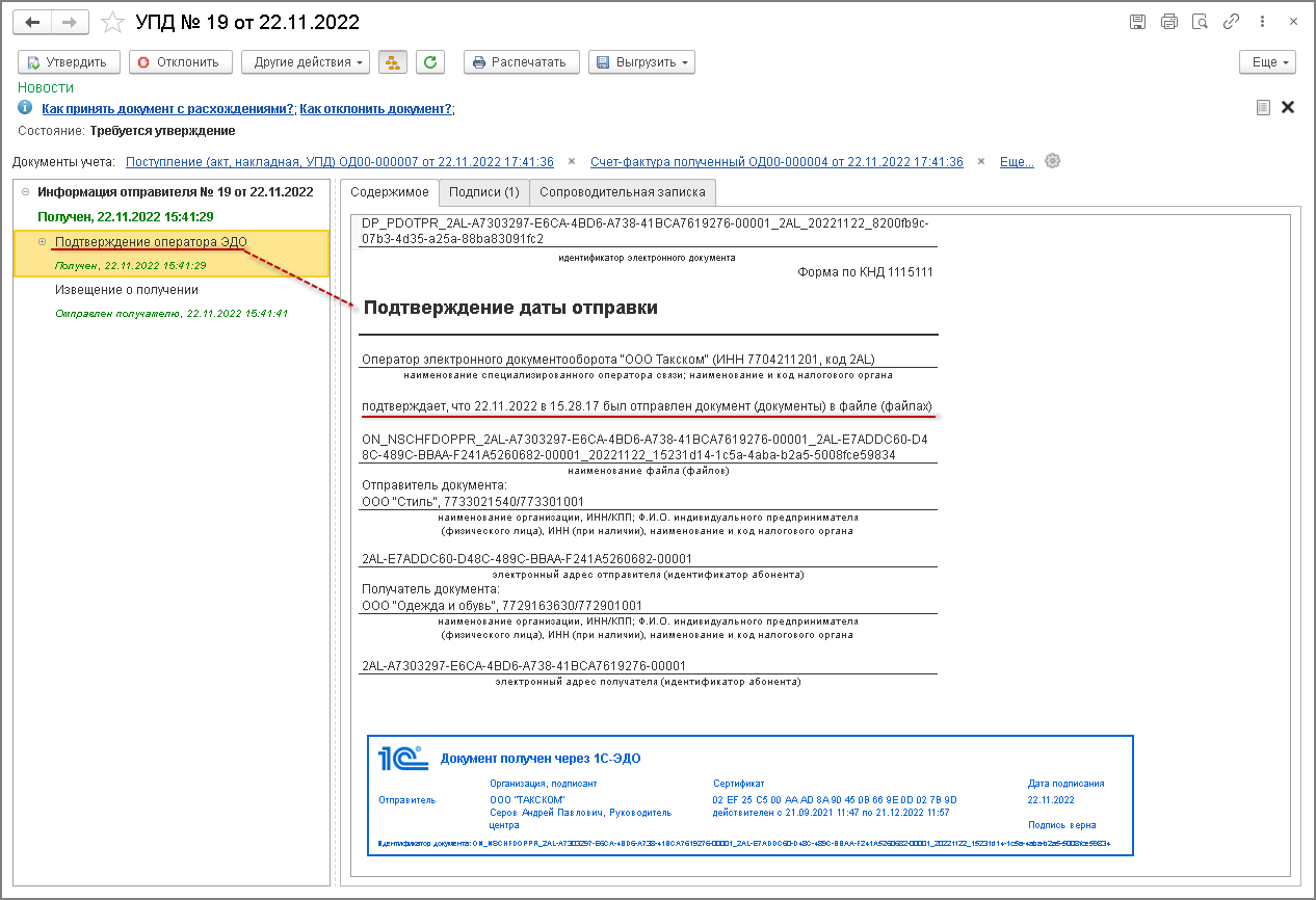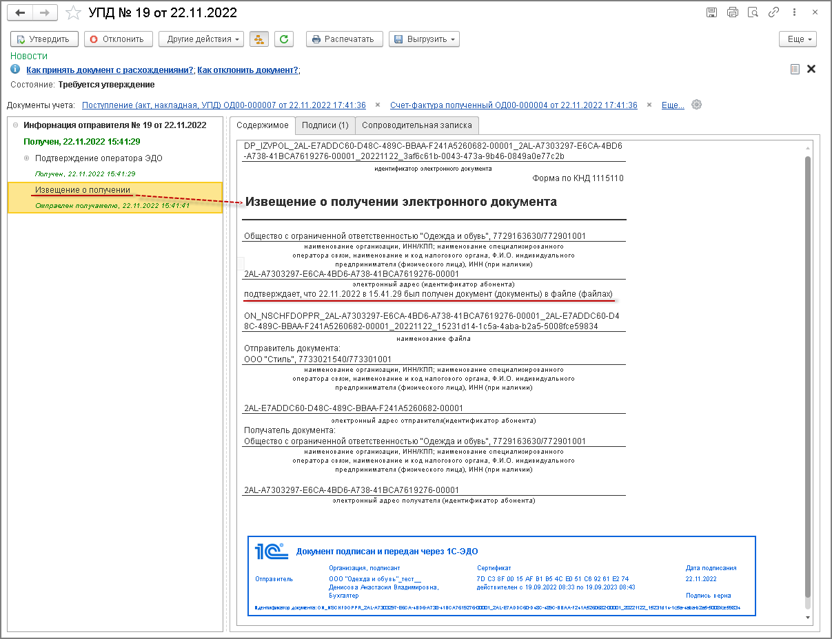 Если у текущего пользователя есть право подписи и сертификат подписи установлен на компьютере, то извещение о получении УПД(СЧФДОП) будет также автоматически подписано и отправлено оператору ЭДО. Если у текущего пользователя права подписи нет, то сформированное извещение будет направлено на подпись лицу, имеющему такое право.