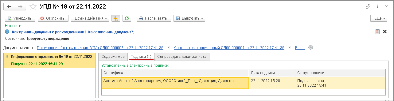Текущее состояние обменного процесса в отношении полученного электронного УПД(СЧФДОП) отражается в информационной строке документа "Состояние ЭДО", где будет размещена гиперссылка Требуется утверждение.