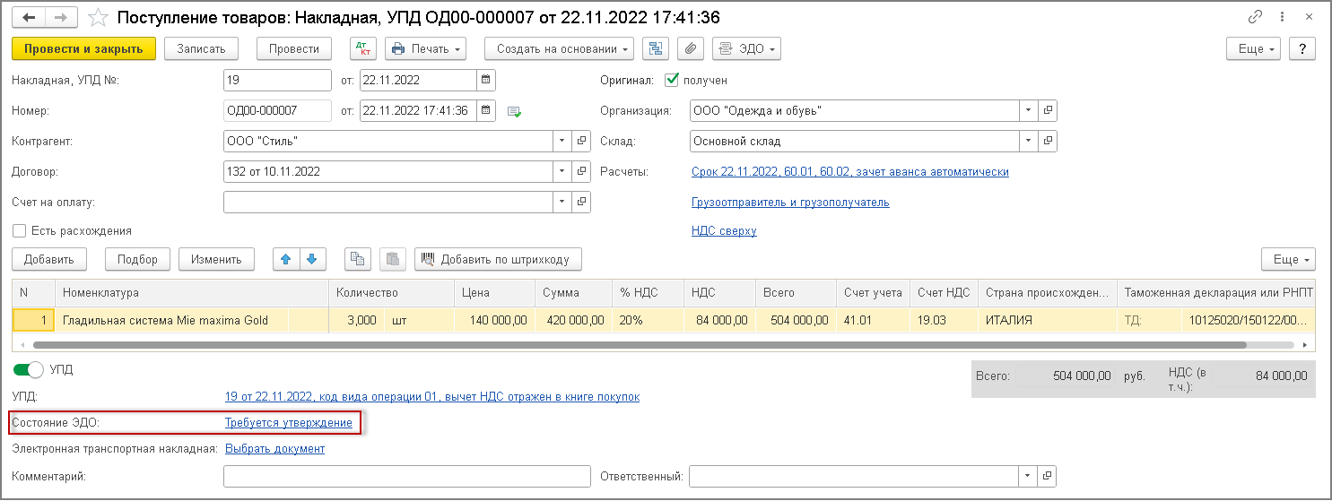 Текущее состояние обменного процесса в отношении полученного электронного УПД(СЧФДОП) будет также отражено в информационной строке "Состояние ЭДО" документа "Счет-фактура полученный", где будет размещена гиперссылка Требуется утверждение.