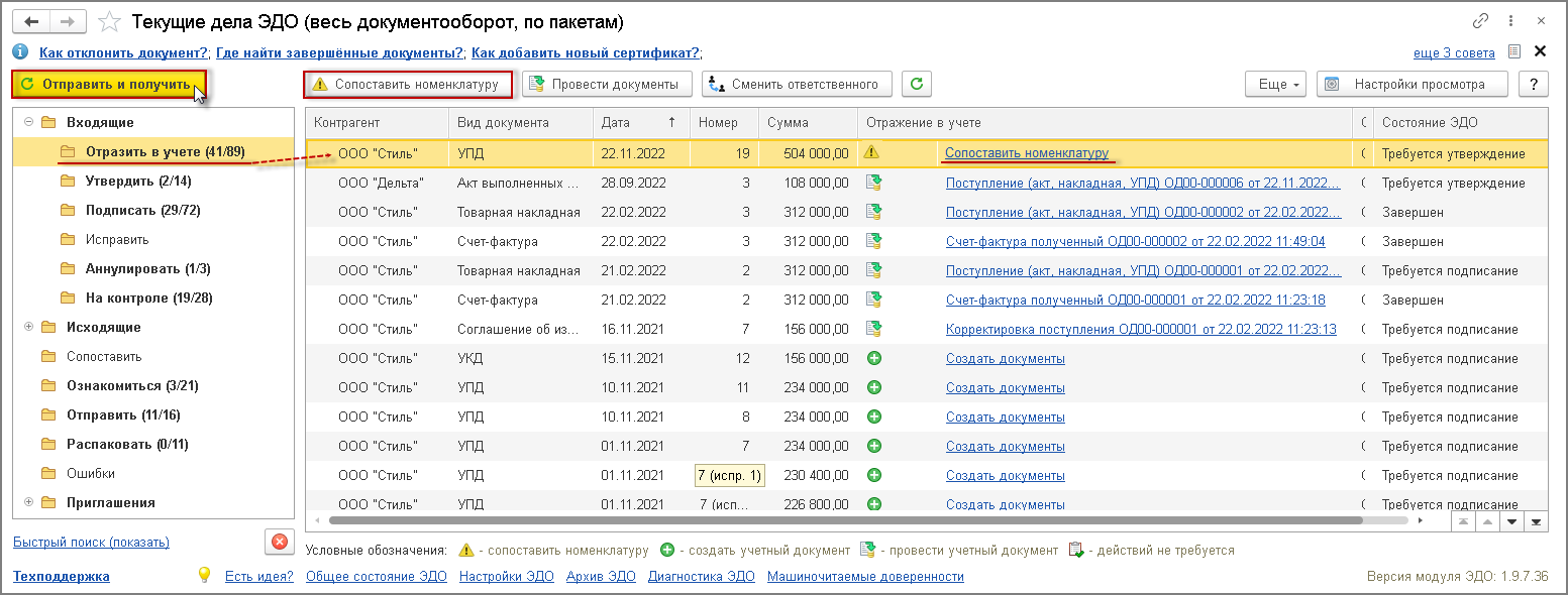 Полученный электронный УПД(СЧФДОП) автоматически помещается в папку "Отразить в учете" формы списка документов "Текущие дела ЭДО" (рис. 1).