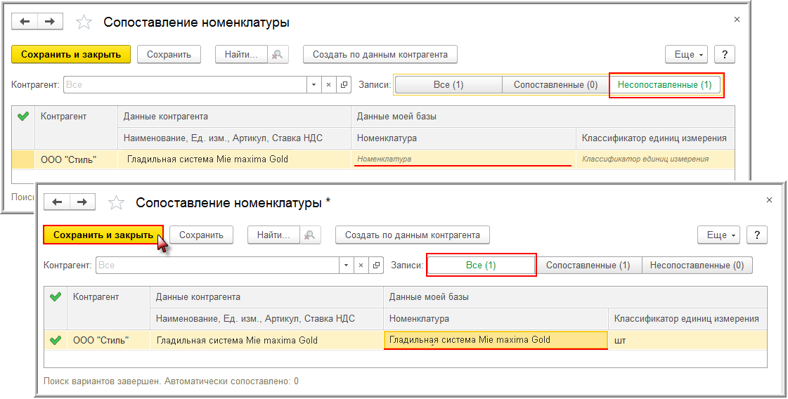 При повторном поступлении сопоставленных товаров от данного поставщика документы