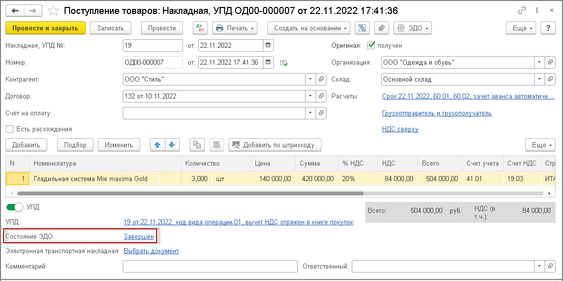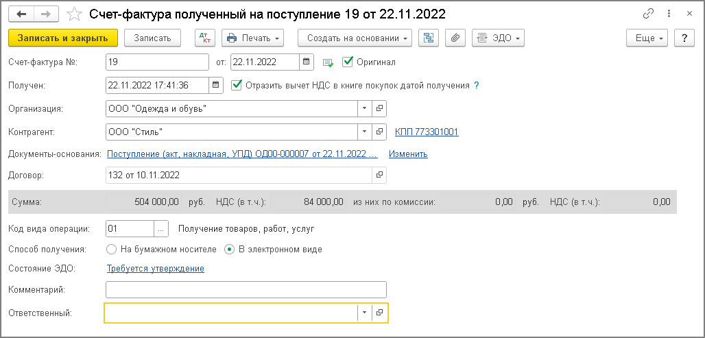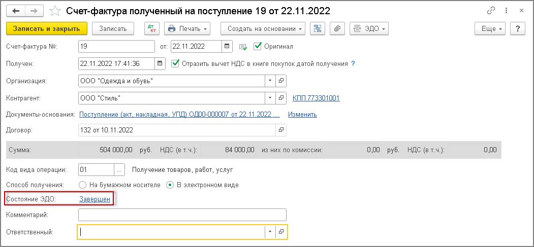 Также в учетной системе на основании поступившего электронного УПД(СЧФДОП) будет автоматически сформирован документ "Счет-фактура полученный".