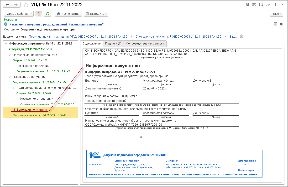 - получить от оператора ЭДО - подтверждение о получении УПД(информации покупателя) (рис. 19);