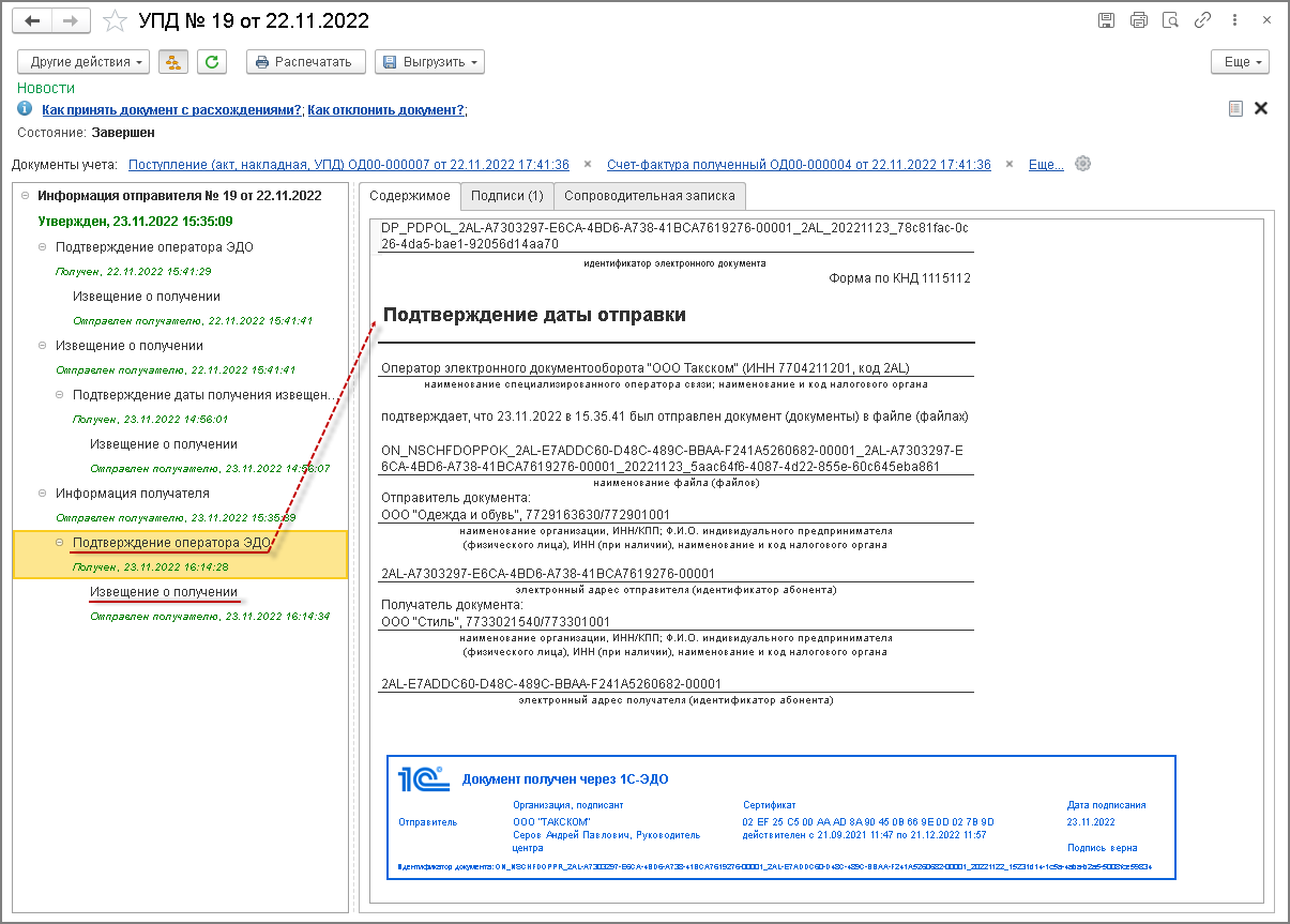 Перейдя по гиперссылке Завершен в строке "Состояние ЭДО" в форму просмотра документа УПД(СЧФДОП) можно удостовериться, что документ подписан обеими сторонами сделки, а также что все документы, сопровождающие обмен УПД(СЧФДОП), получены и отправлены (рис. 22).