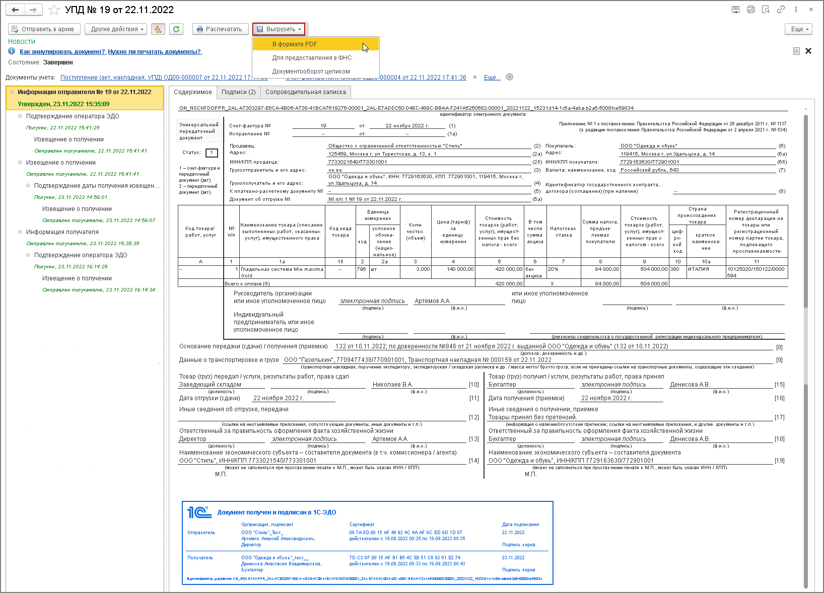 Также из формы просмотра по кнопке Выгрузить можно выполнить сохранение электронного УПД(СЧФДОП) (в формате PDF, для представления в ФНС, документооборот целиком).