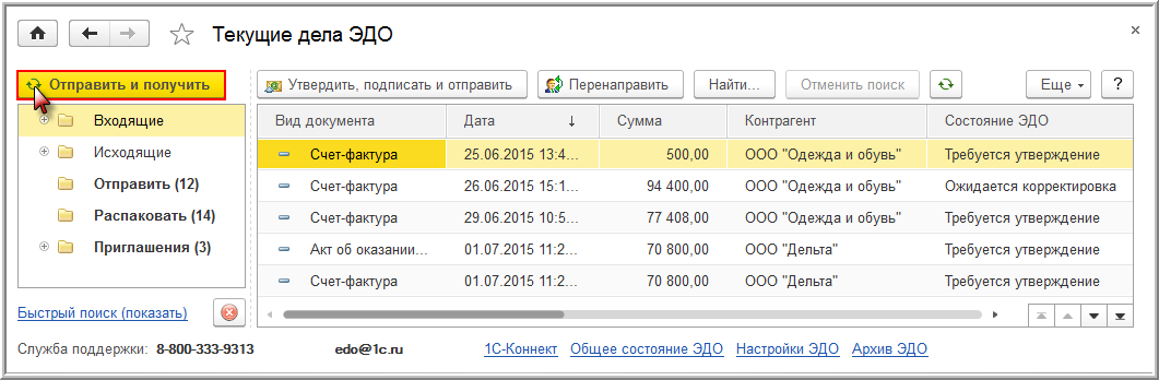 - по команде Отправить и получить из формы списка документов "Текущие дела ЭДО", открываемого по гиперссылка панели команд Текущие дела ЭДО (раздел Администрирование - подраздел Сервис или раздел Руководителю - подраздел Сервис, или раздел Продажи - подраздел Сервис) (рис. 1);