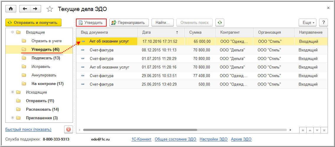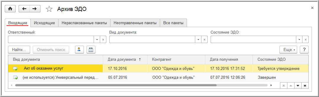 Полученный электронный УПД автоматически помещается в папку "Утвердить" формы списка документов "Текущие дела ЭДО" (рис. 3).