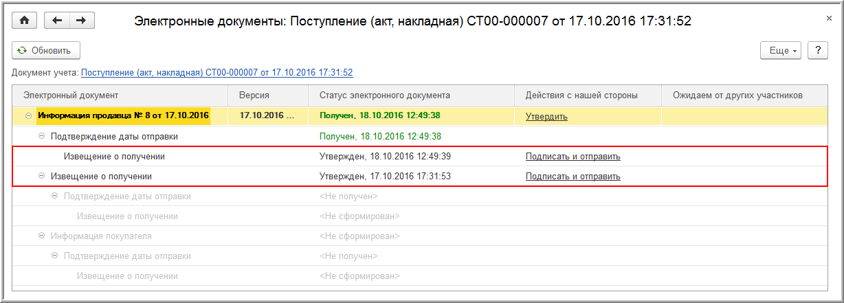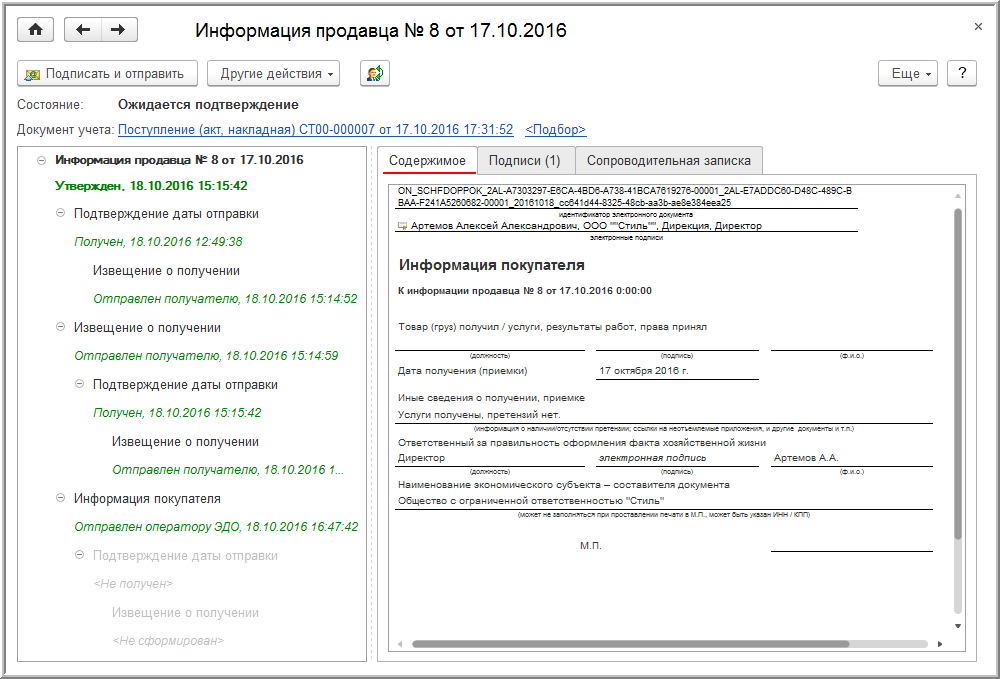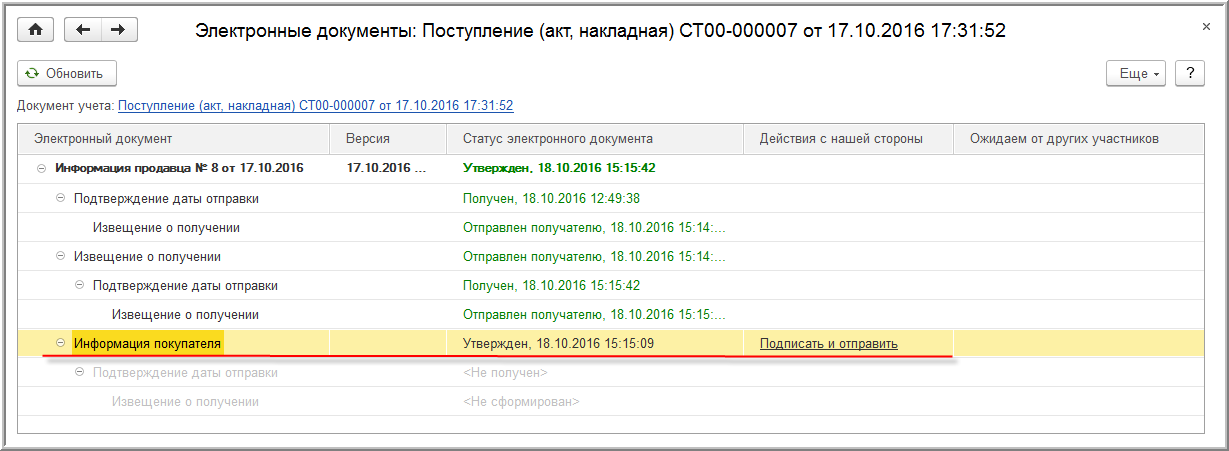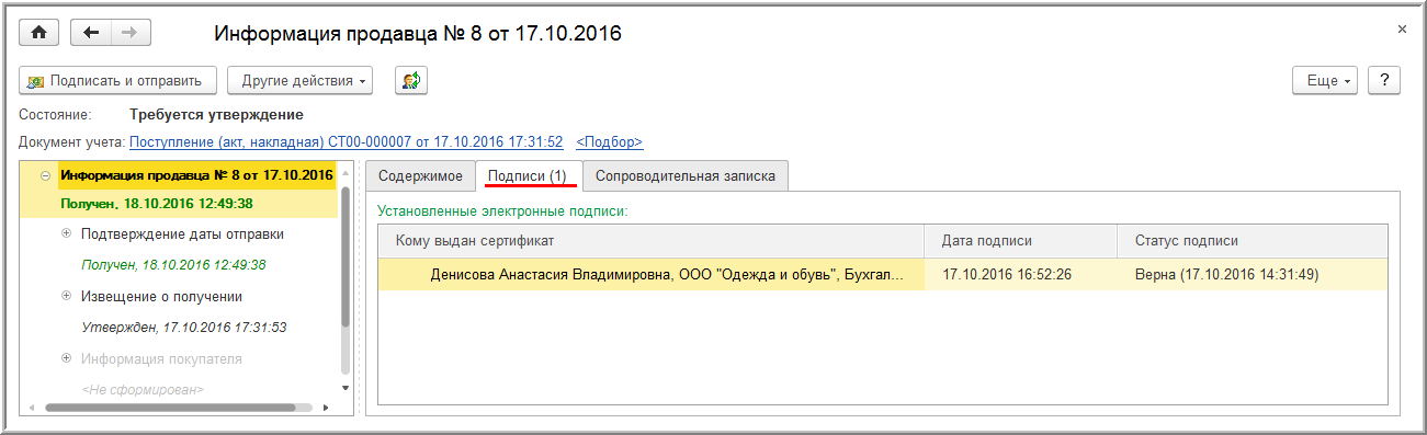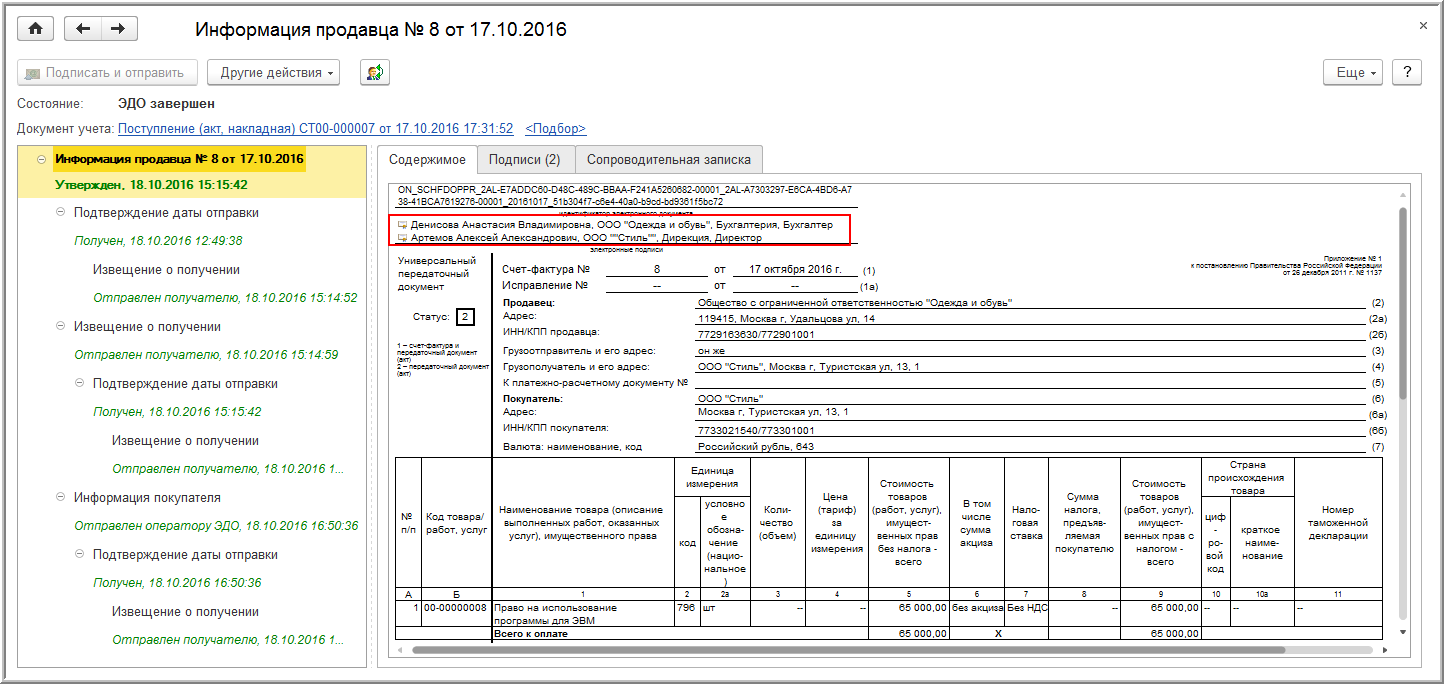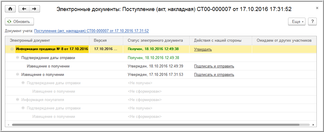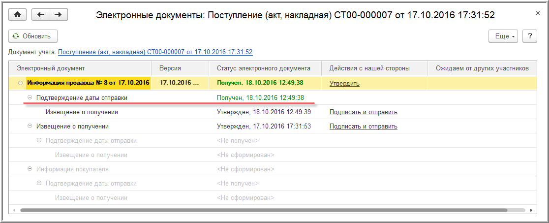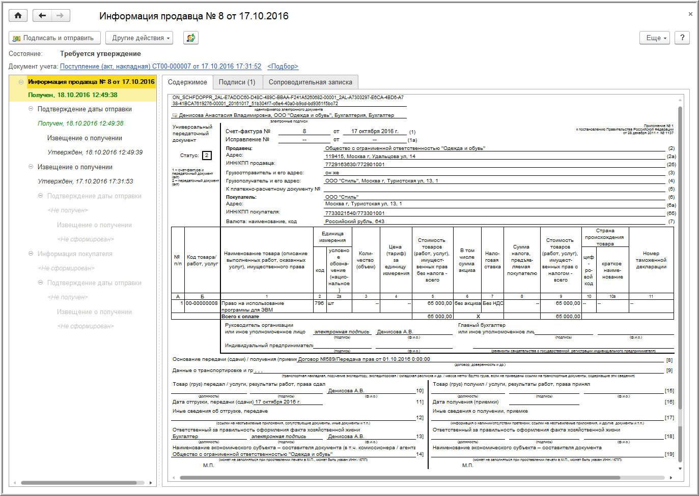 Если претензий к показателям УПД у покупателя нет, то он утверждает полученный документ. Именно после утверждения поступившего УПД автоматически формируется соответствующая информация покупателя.