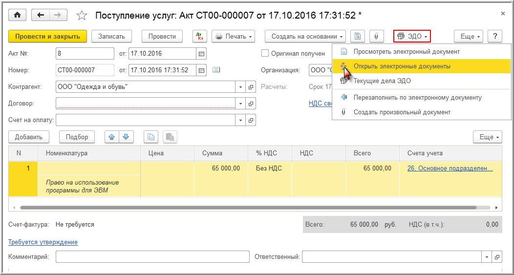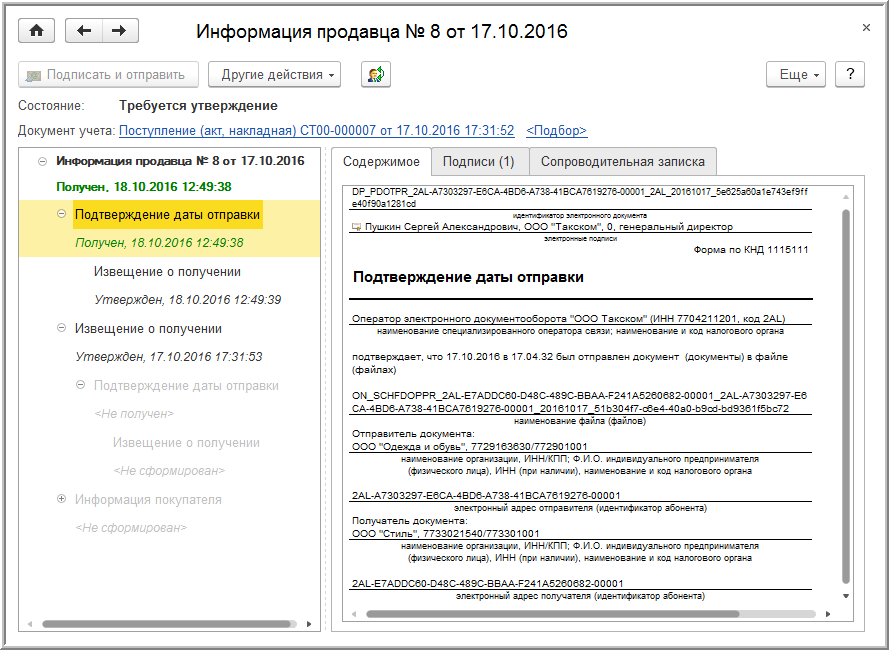 Текущее состояние обменного процесса в отношении полученного электронного УПД отражается в информационной строке документа, где будет указано, что "Требуется утверждение" (рис. 7).