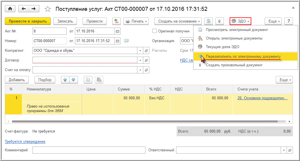 Для его заполнения необходимо произвести сопоставление номенклатуры продавца (лицензиара) и покупателя (лицензиата), перезаполнив документ "Поступление (акт, накладная)" по команде Перезаполнить по электронному документу из списка команд, открываемого по кнопке ЭДО (рис. 9).