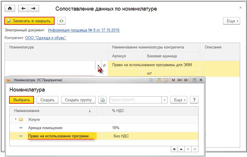 Следует обратить внимание, что если данная номенклатурная позиция приобретена у данного продавца (лицензиара) впервые, и номенклатуры продавца (лицензиара) и покупателя (лицензиата) не синхронизированы, то в документе "Поступление (акт, накладная)" будет отсутствовать наименование в поле "Номенклатура".