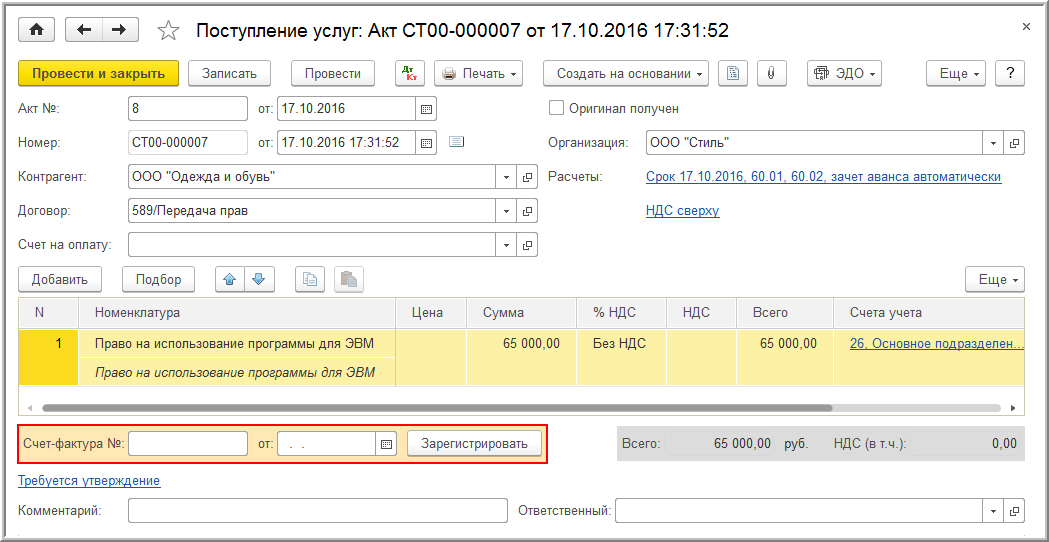 Поскольку продавец (лицензиар) передает право на использование программы для ЭВМ, т.е. осуществляет операцию, освобождаемую от НДС согласно пп. 26 п. 2 ст. 149 НК РФ, то в соответствии с пп. 1 п. 3 ст. 169 НК РФ он не выставляет покупателю (лицензиату) счет-фактуру. Поэтому поля "Счет-фактура №" и "от" под табличной частью документа "Поступление (акт, накладная)" остаются незаполненными.