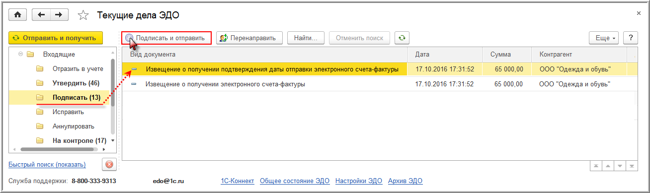 - по кнопке Подписать и отправить из папки "Подписать" списка "Текущие дела ЭДО", открываемого по гиперссылке Текущие дела ЭДО (раздел Администрирование - подраздел Сервис или раздел Руководителю - подраздел Сервис, или раздел Продажи - подраздел Сервис) (рис. 15).