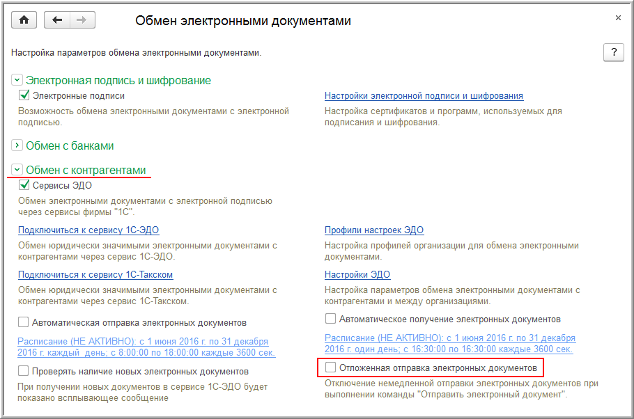 Также можно установить расписание получения электронных документов, выполнив соответствующую настройку параметров обмена электронными документами с контрагентами (раздел Администрирование - гиперссылка Обмен электронными документами) (рис. 2).